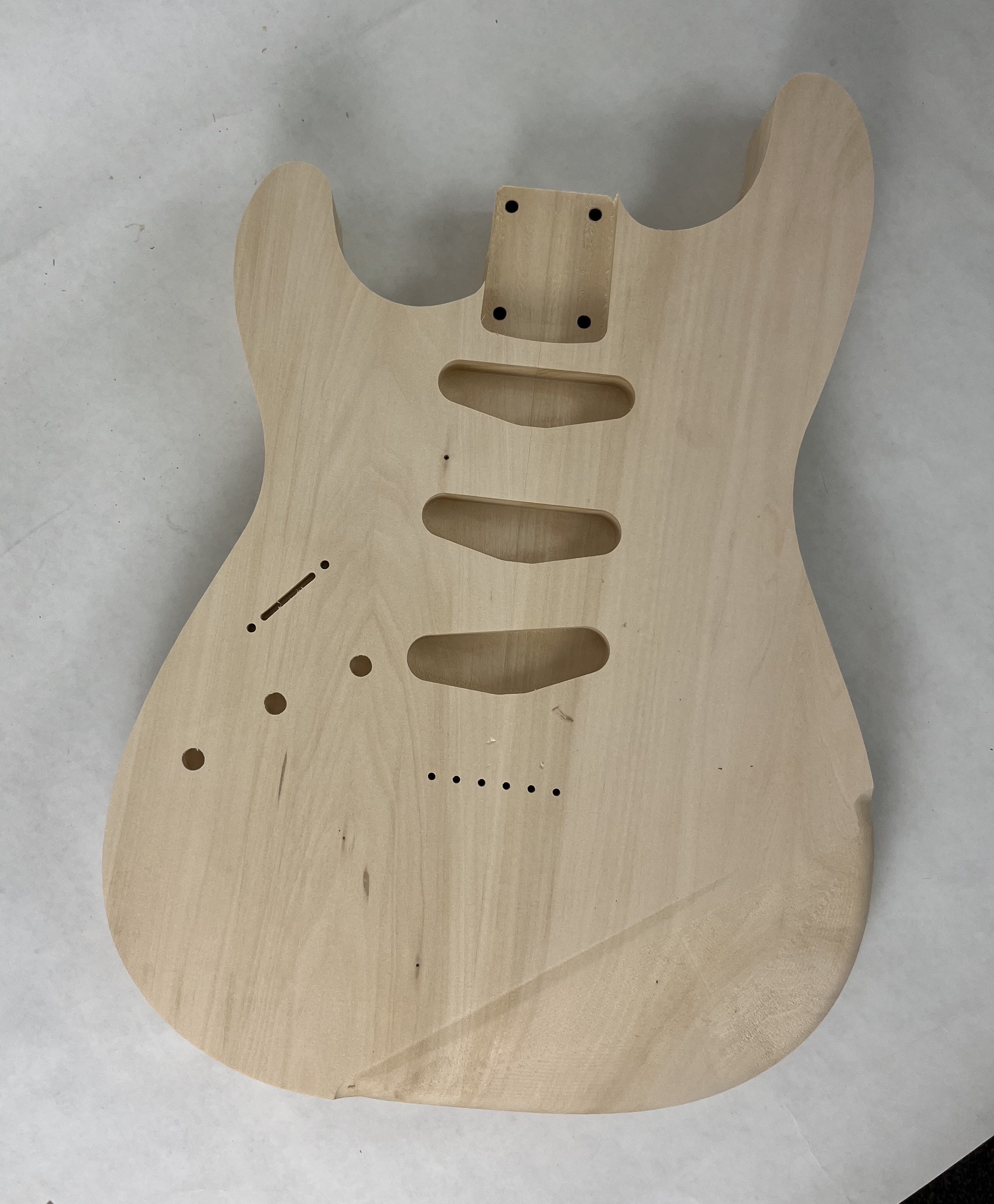 Beautiful Strat style guitar body with the deep contours and slim profile of the classics was made in our custom shop right here in Amherst, NH.